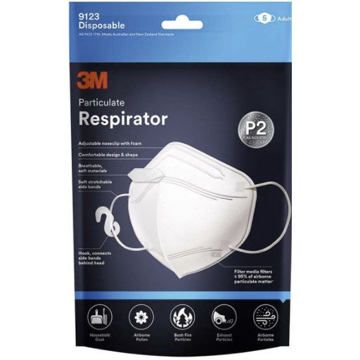 Now you can breathe easy when wearing the 3M P2 Particulate Respirator, which filters airborne particles such as airborne pollen, bushfire particles, exhaust particles and other airborne particles. Meets Australian and New Zealand Standards, AS NZS 1716. The 3M P2 Particulate Respirator 9123 is a maintenance-free, flat fold disposable respirator that is intended for use by consumers used in consumer applications (and other users where permitted by applicable regulations) to help reduce exposure to certain airborne particulate matter. The respirator is worn over the mouth and nose and attaches via elastic side bands with hook attachment behind the base of the head, top of the neck. When used as instructed, this respirator can help reduce inhalation exposure to certain types of non-oily airborne particles, such as dirt, dust, sand, vehicle exhaust particles, pollen, environmental air pollution, PM2.5 fine particles, PM10 and other airborne particulate matter. 159x200mm. Pack of 5.