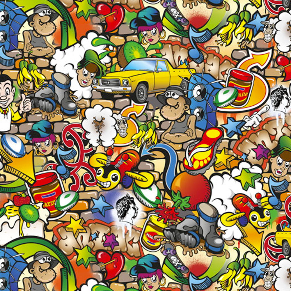 A fun multi-coloured Graffiti design featuring lots of Kiwiana elements.